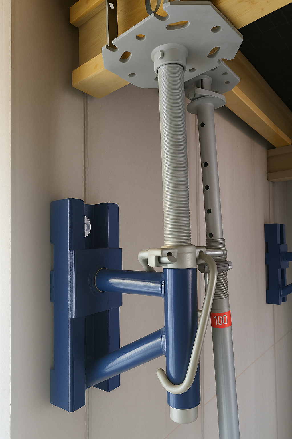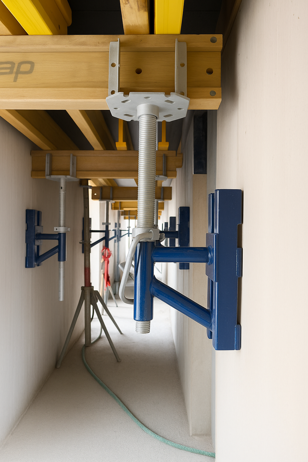 En obra, los pasillos de acceso suelen quedar obstruidos por los puntales del encofrado de losa en el nivel inferior. Pensando en la seguridad y eficiencia del proceso constructivo, desarrollamos un sistema innovador que libera las zonas de tránsito, manteniendo un soporte firme y seguro para el encofrado.
